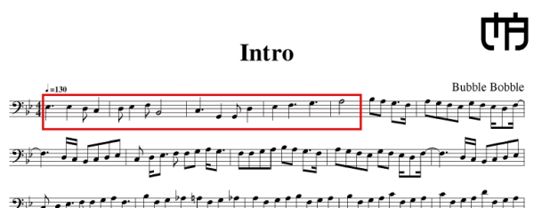 赤い枠で囲った部分がイントロにあたる所ですが、メロディしか載せてありません。