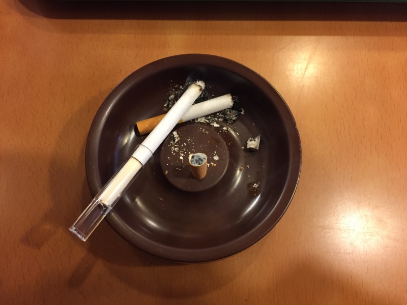 灰皿の中央に、ちぎったフィルターを立てているのですが、そのフィルターのところどころが黒くなっています。