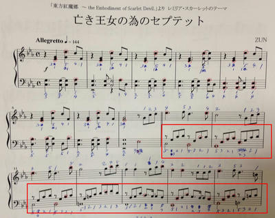 赤線で区切った部分、両手で練習する以前にどういう音がするかをまだ把握していないので、今日の練習ではこの部分を繰り返して弾いてました。