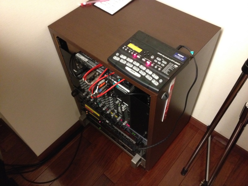リズムマシーンは自前のもの、アンプ(ミキサー)は音楽スタジオに備え付けのものです。
